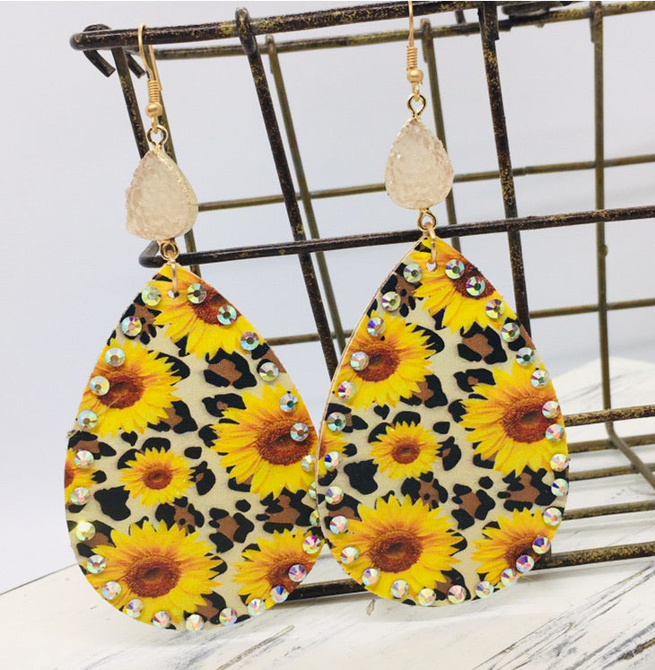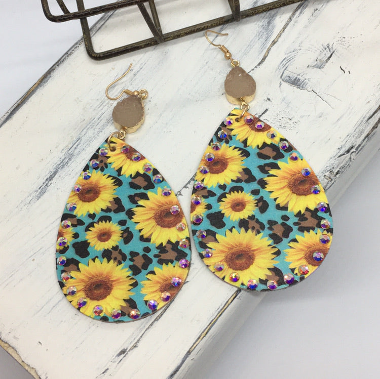 "Sunflowers & Rhinestones" Leopard Print Faux Leather Large Statement Earrings--Turquoise