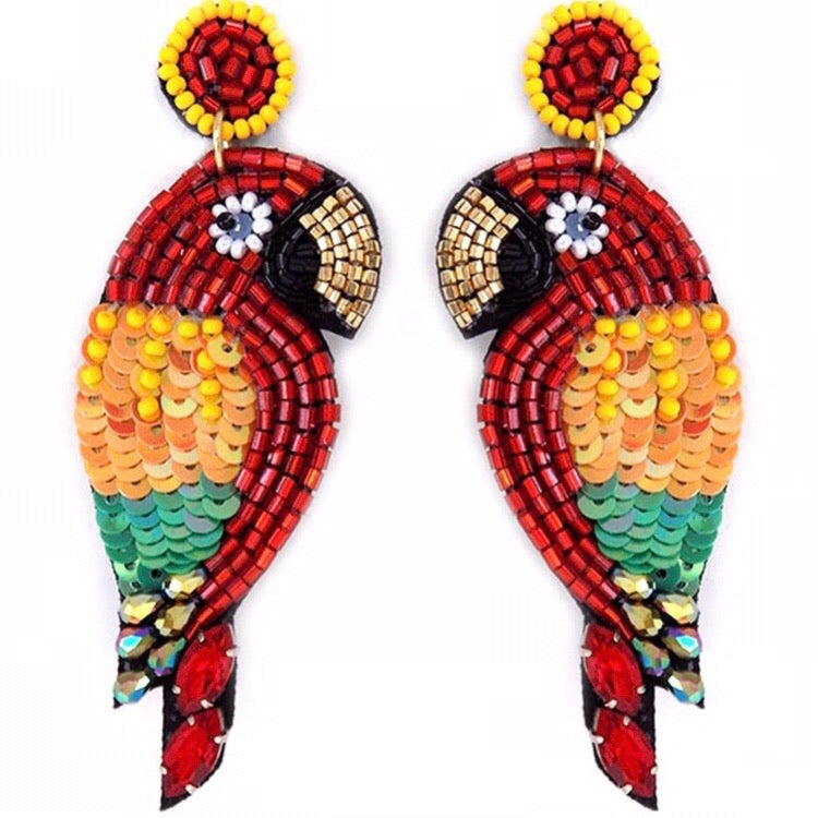 "Treasure Isle" Parrot Macaw Tropical Bird Bead & Sequin Statement Earrings--Handcrafted
