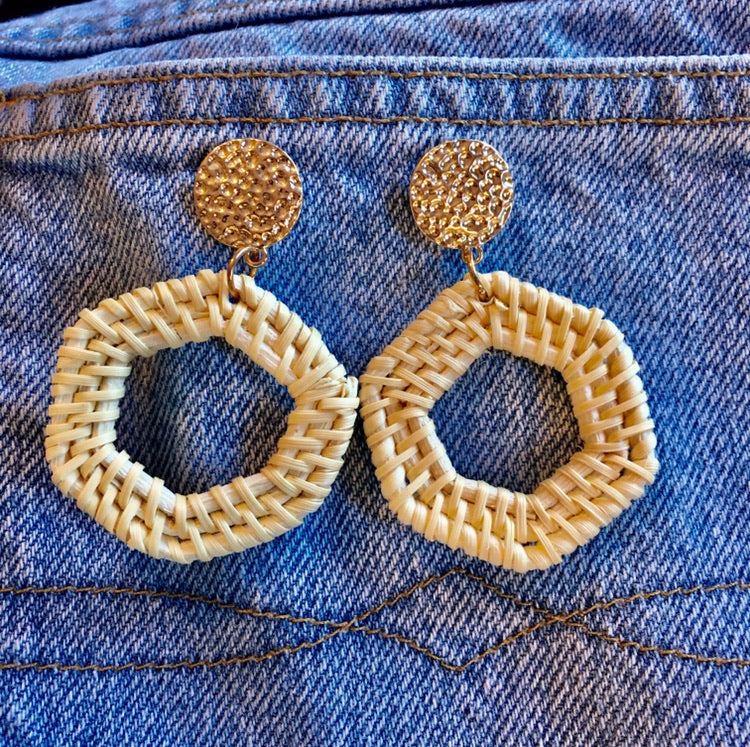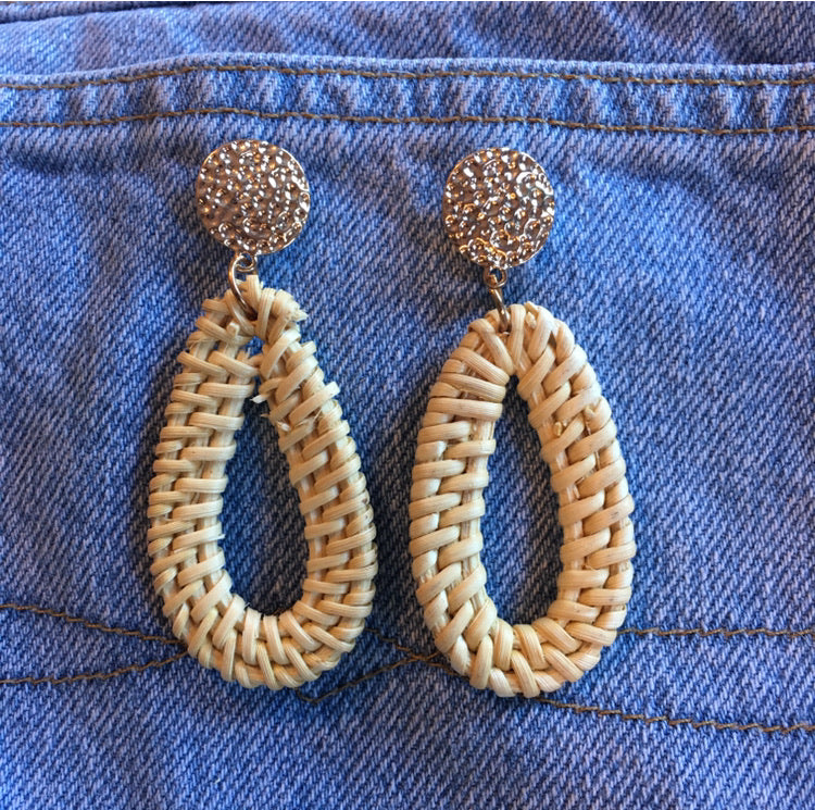 "Rosalind" Teardrop Rattan Dangle Statement Post Earrings--Handmade